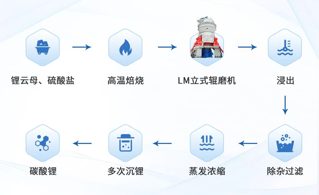 硫酸盐法是目前从锂云母中提取锂最常用的方法,以硫酸盐作为焙烧助剂,高温焙烧后转化为可溶性硫酸锂浸出以实现锂溶出。基于对锂电材料工艺的深刻洞察,黎明重工推出的新能源行业原辅材料粉磨成套工艺,适用于锂辉石、锂云母、高冰镍等新能源原辅材料的大型智能化制粉需求,为锂电材料的高品质制备提供了可靠保障。