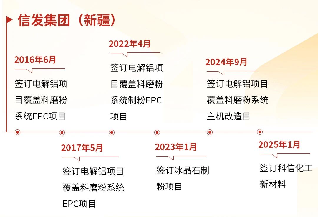 黎明重工精准适配新疆地域特性与产业发展需求,赢得疆内龙头企业的高度认可与持续信赖。与信发集团2016年合作至今,九年间累计达成6次合作,聚焦电解铝领域提供电解槽覆盖料磨粉、冰晶石制粉、氟化工固废资源化利用等粉磨工程和服务,精准赋能铝业高效生产。