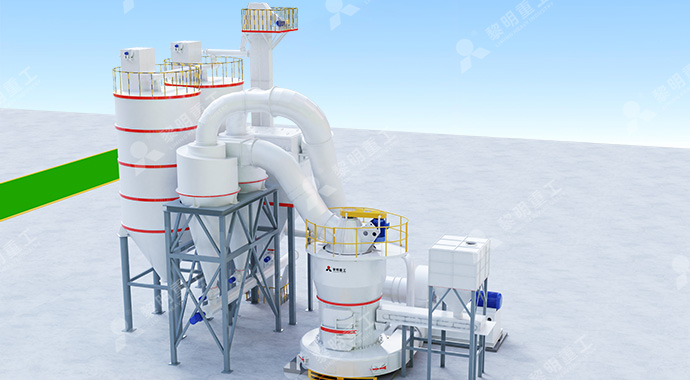 破碎后合格的物料,经变频皮带给料机均匀定量连续地送入主机磨室内进行研磨。粉磨后的物料被风机气流送入选粉机进行分级,在分析机的作用下,不符合细度要求的物料落入磨室内重新碾磨,合格的物料则随气流经管道进入旋风集粉器内,进行分离收集,经排料装置排出即为成品粉体。分离后的气流通过旋风集粉器上端回风管进入风机。该系统在正负压状态下运行,设备配有脉冲除尘器,符合国家环保标准。